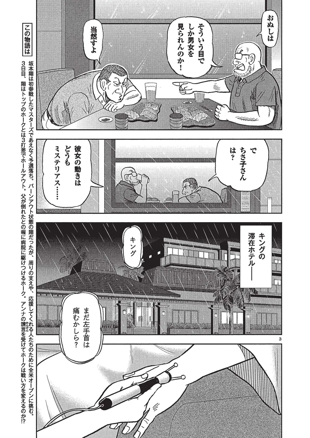 坂本翔は初参戦したマスターズであえなく予選落ち。バーンアウト状態の翔だったが、周りの支えや、応援してくれる人たちのためにペブルビーチでの全米オープンに挑む。3日目、遅刻した翔は2ペナを課せられ出遅れるが、トップのホークとは3打差でホールアウト。父が倒れたとの報に病院に駆けつけるホーク。アンナの諫言を受けてホークは戦い方を変えるのか!?