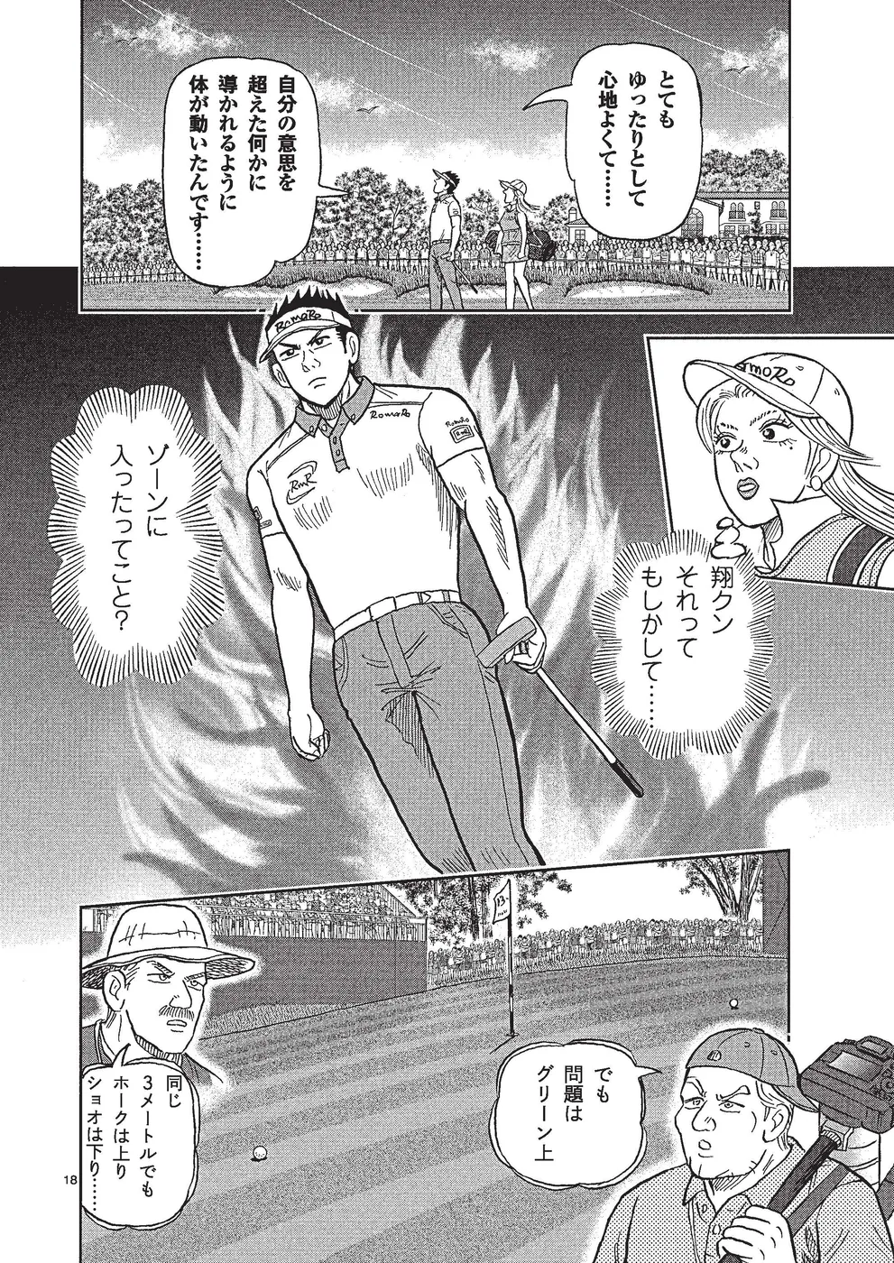 坂本翔は初参戦したマスターズであえなく予選落ち。バーンアウト状態の翔だったが、周りの支えや、応援してくれる人たちのためにペブルビーチでの全米オープンに挑む。3日目を終えて翔はトップのホークとは3打差。最終日はスリーサムとなり、翔はキングとホークと回ることに。迎えた最終日、アマチュアの真之介も加えたバックナインの激闘が続く!