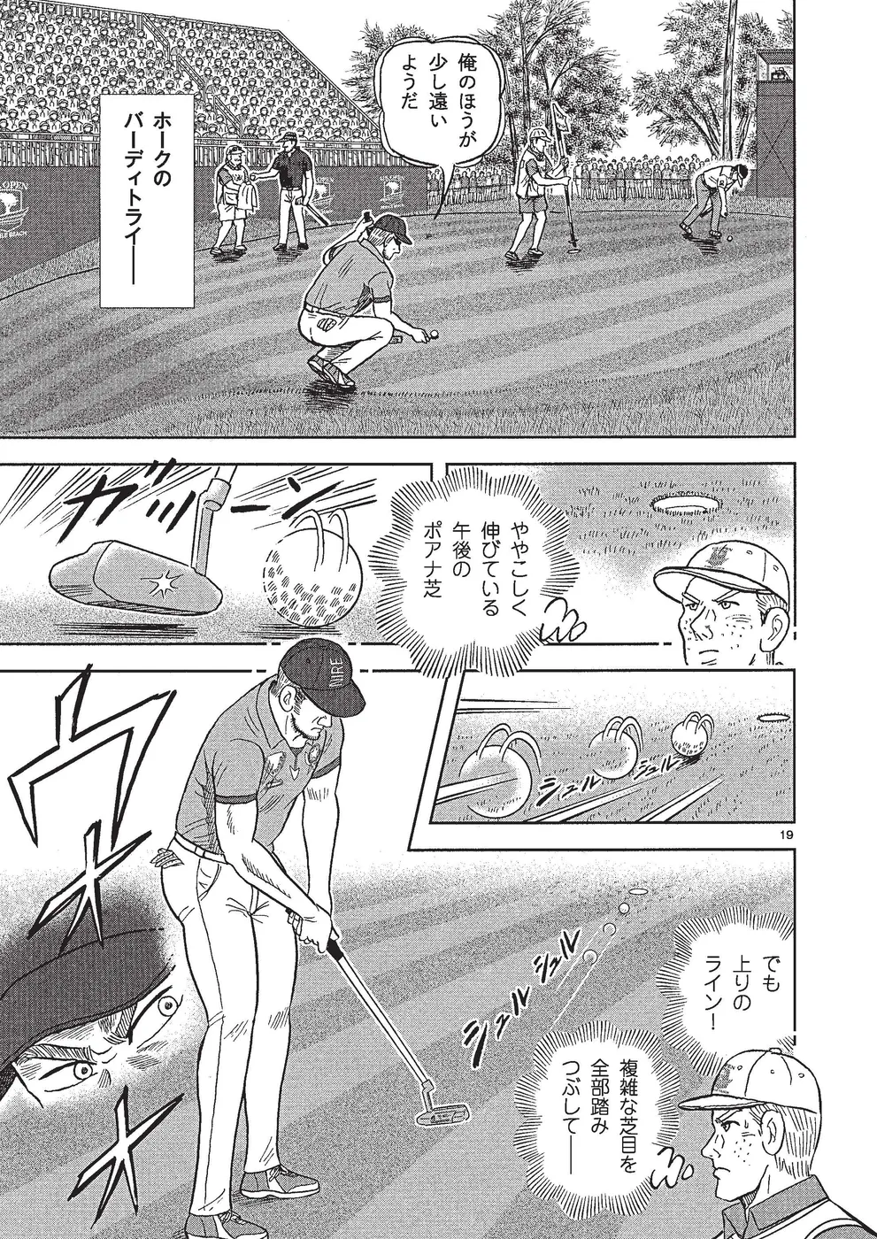 坂本翔は初参戦したマスターズであえなく予選落ち。バーンアウト状態の翔だったが、周りの支えや、応援してくれる人たちのためにペブルビーチでの全米オープンに挑む。3日目を終えて翔はトップのホークとは3打差。最終日はスリーサムとなり、翔はキングとホークと回ることに。迎えた最終日、アマチュアの真之介も加えたバックナインの激闘が続く!