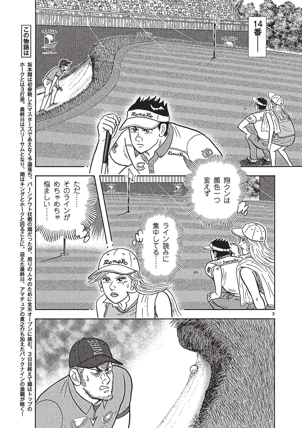 坂本翔は初参戦したマスターズであえなく予選落ち。バーンアウト状態の翔だったが、周りの支えや、応援してくれる人たちのためにペブルビーチでの全米オープンに挑む。3日目を終えて翔はトップのホークとは3打差。最終日はスリーサムとなり、翔はキングとホークと回ることに。迎えた最終日、アマチュアの真之介も加えたバックナインの激闘が続く!