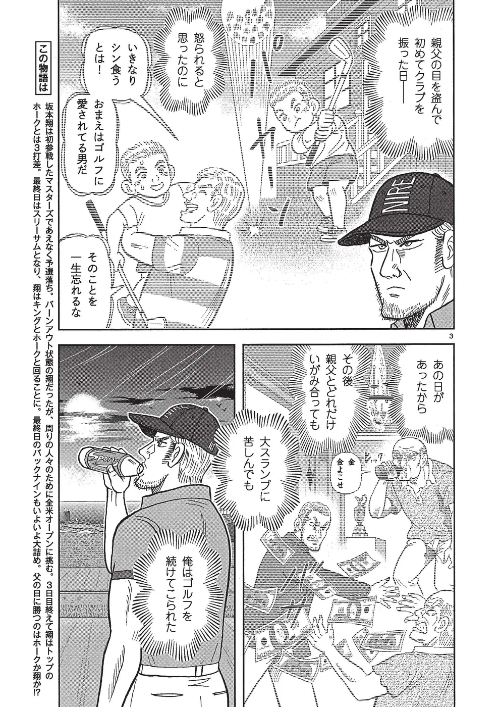坂本翔は初参戦したマスターズであえなく予選落ち。バーンアウト状態の翔だったが、周りの支えや、応援してくれる人たちのためにペブルビーチでの全米オープンに挑む。3日目を終えて翔はトップのホークとは3打差。最終日はスリーサムとなり、翔はキングとホークと回ることに。最終日のバックナインもいよいよ大詰め。父の日に勝つのはホークか翔か!?