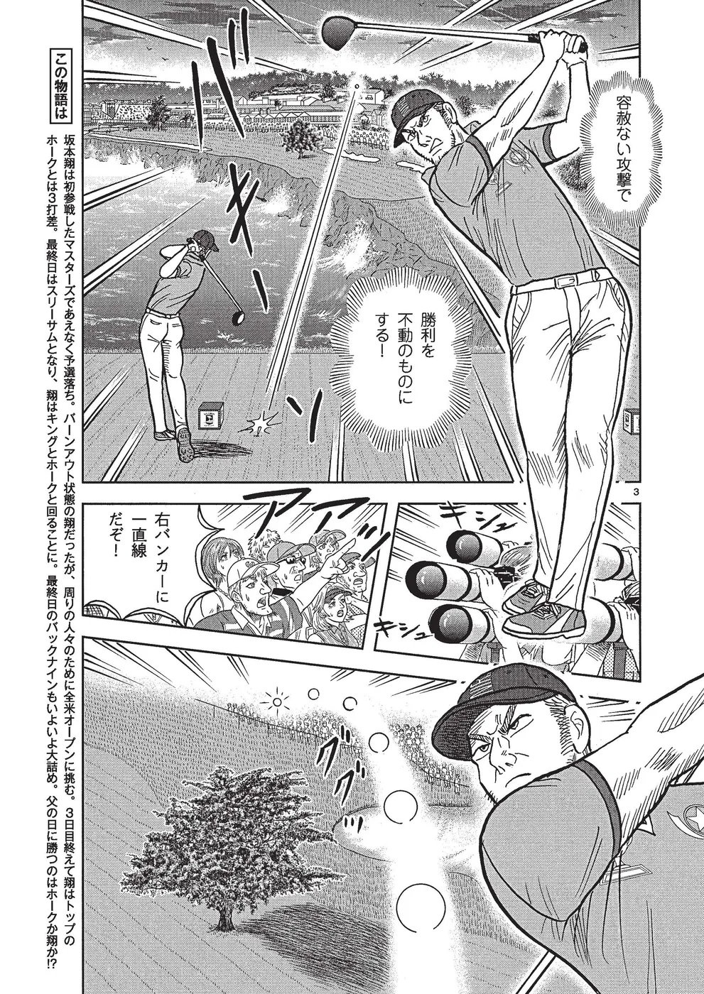 坂本翔は初参戦したマスターズであえなく予選落ち。バーンアウト状態の翔だったが、周りの支えや、応援してくれる人たちのためにペブルビーチでの全米オープンに挑む。3日目を終えて翔はトップのホークとは3打差。最終日はスリーサムとなり、翔はキングとホークと回ることに。最終日のバックナインもいよいよ大詰め。父の日に勝つのはホークか翔か!?