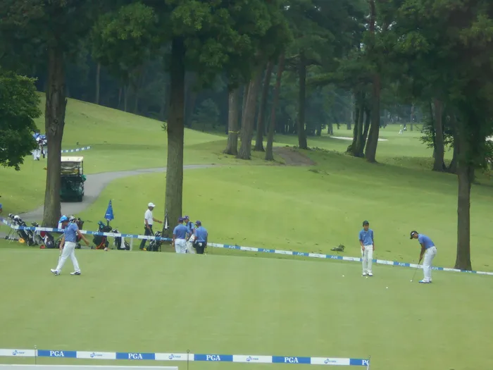 着ているウエアはブラック&ホワイトとPGAのコラボシャツ