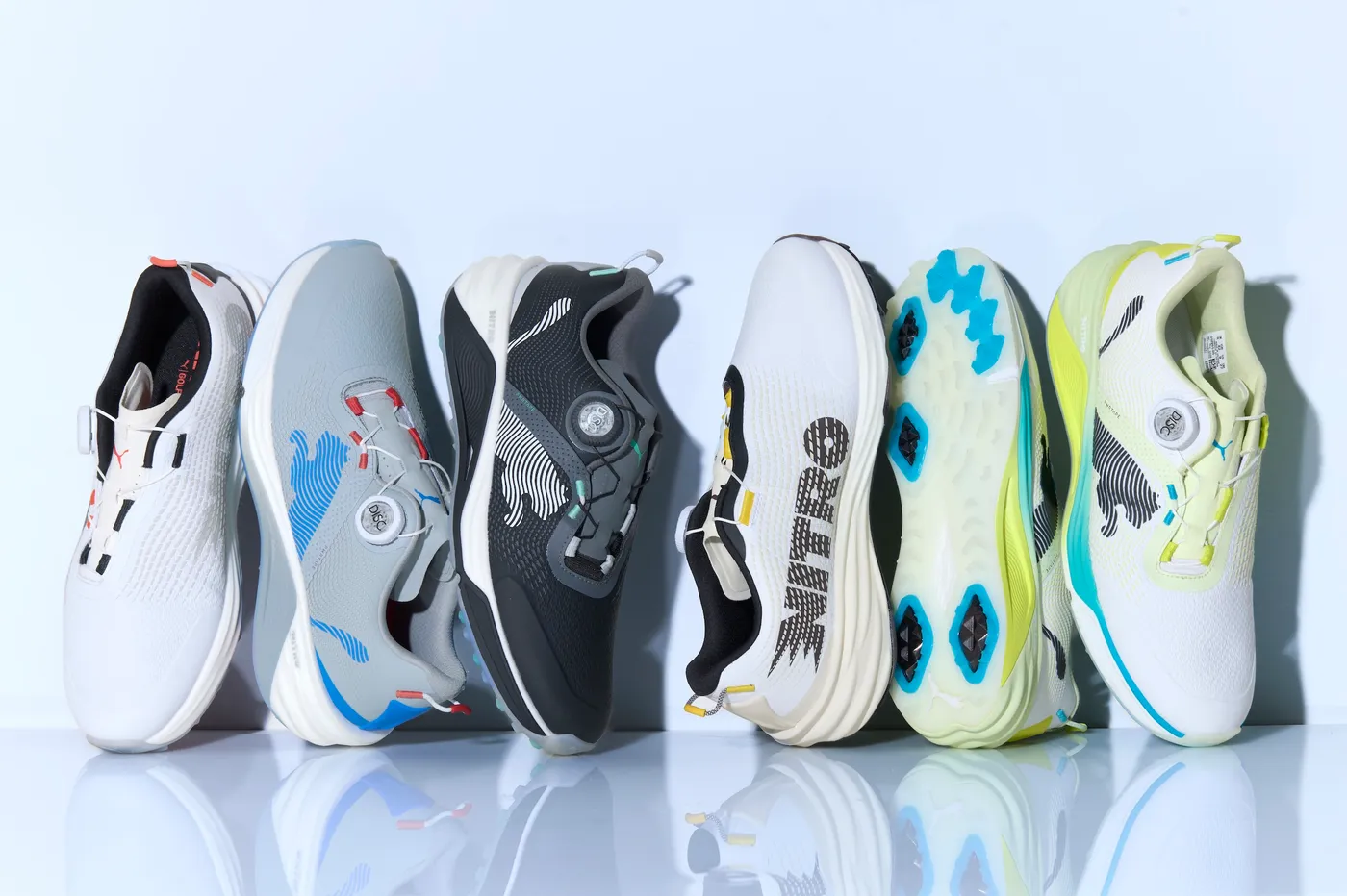 DISCシステム搭載モデルの色は左から「PUMA White/PUMA Black」「Cool Mid Gray/Racing Blue」「PUMA Black/PUMA White」「PUMA White/Chocolate Brown」「PUMA White/Puma Black/Apple Spirtz」の5色展開