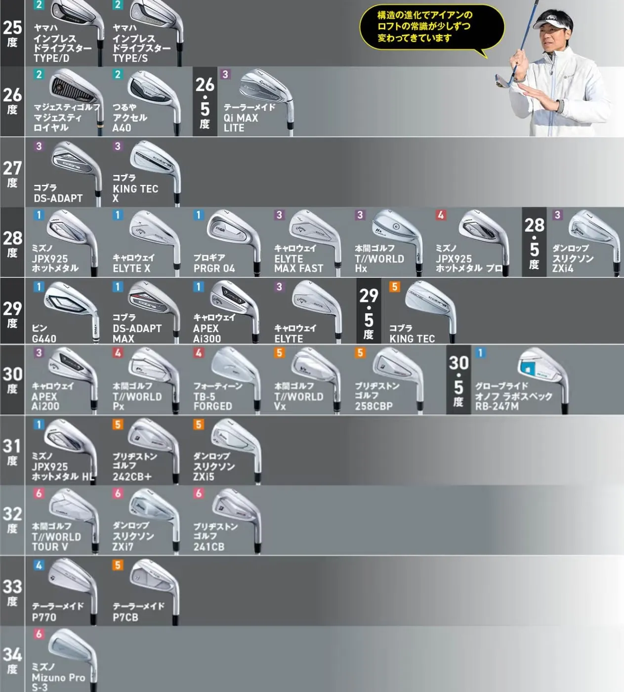 最新アイアン34モデルで7番のロフト一覧表を作ってみたら、平均は29.2度だった!