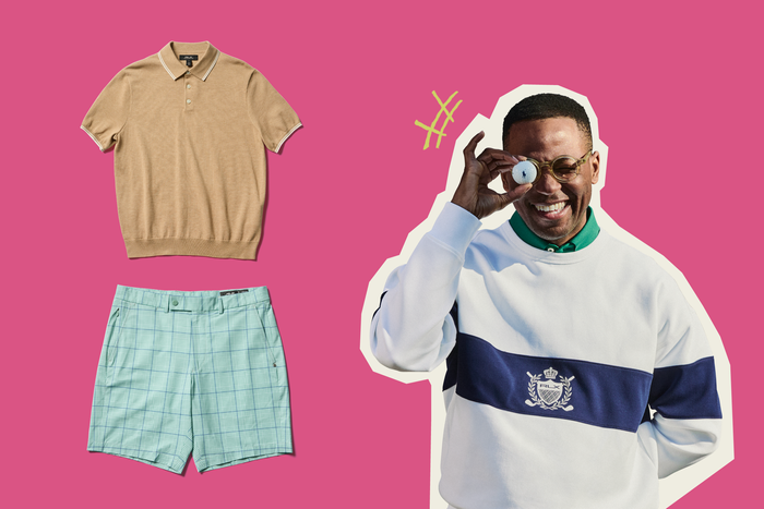 【写真1】[左]ハット¥14,300、ベスト¥26,400、ポロシャツ¥23,100、ショートパンツ¥27,500、羽織ったニット¥26,400、ゴルフトート¥18,700、キャディバッグ¥49,500ヘッドカバー[DR・FW・UT]各¥8,470 /すべてアールエルエックス ゴルフ、その他 スタイリスト私物[右上]キャップ¥13,200[右下]スウェット¥30,800