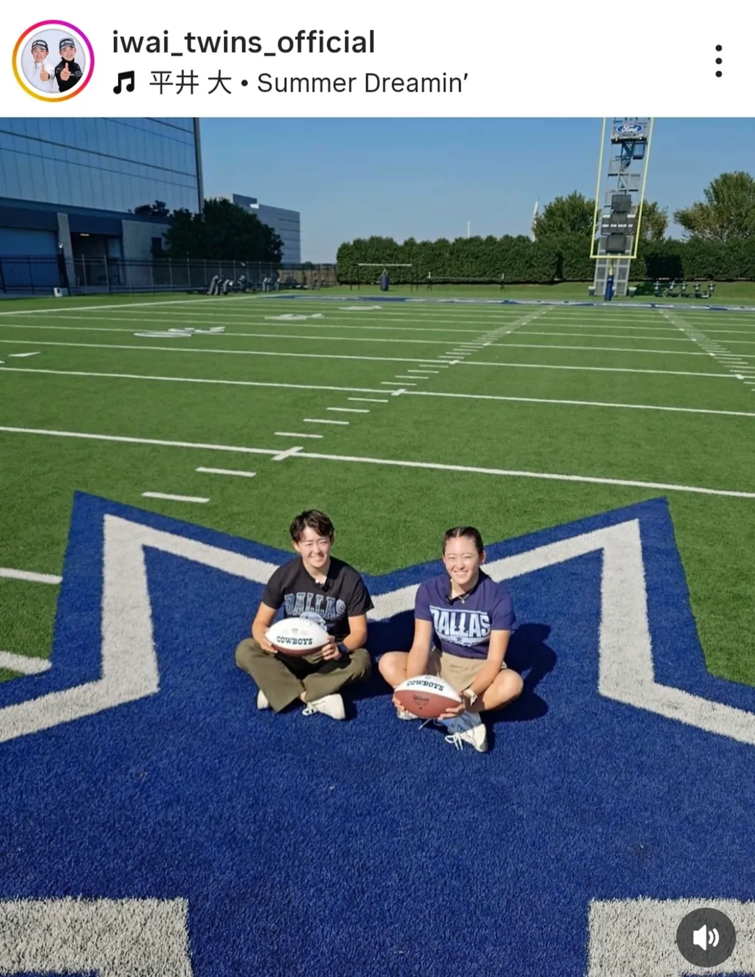 岩井明愛&千怜がNFLダラス・カウボーイズの練習場を訪問 アメフト選手と並んだ写真が大反響「twinsがちっちゃく見えて可愛いすぎ」