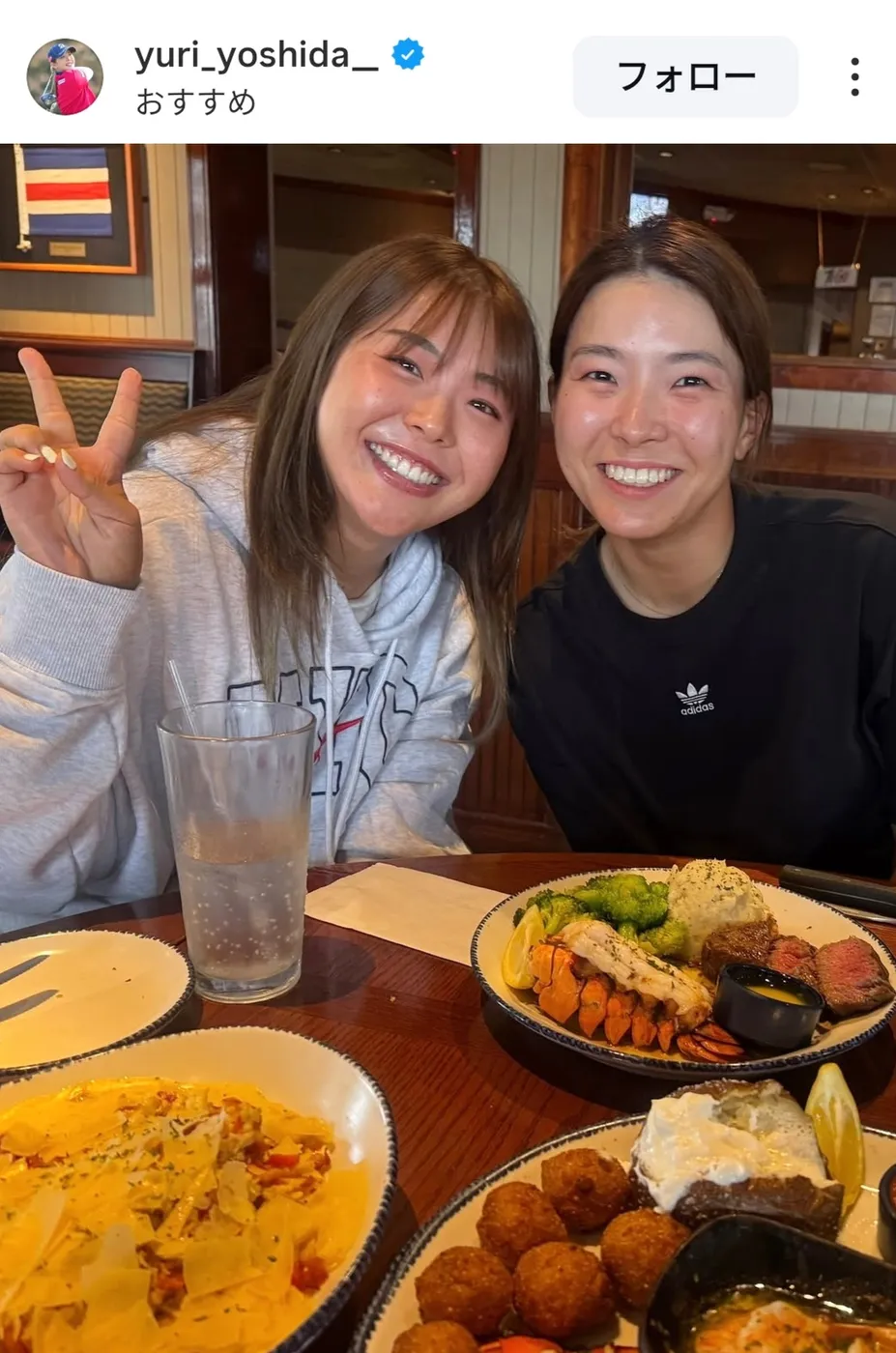 吉田優利と渋野日向子がギュッとハグ! 仲よし2ショットを一挙に公開、笑顔の食事風景も