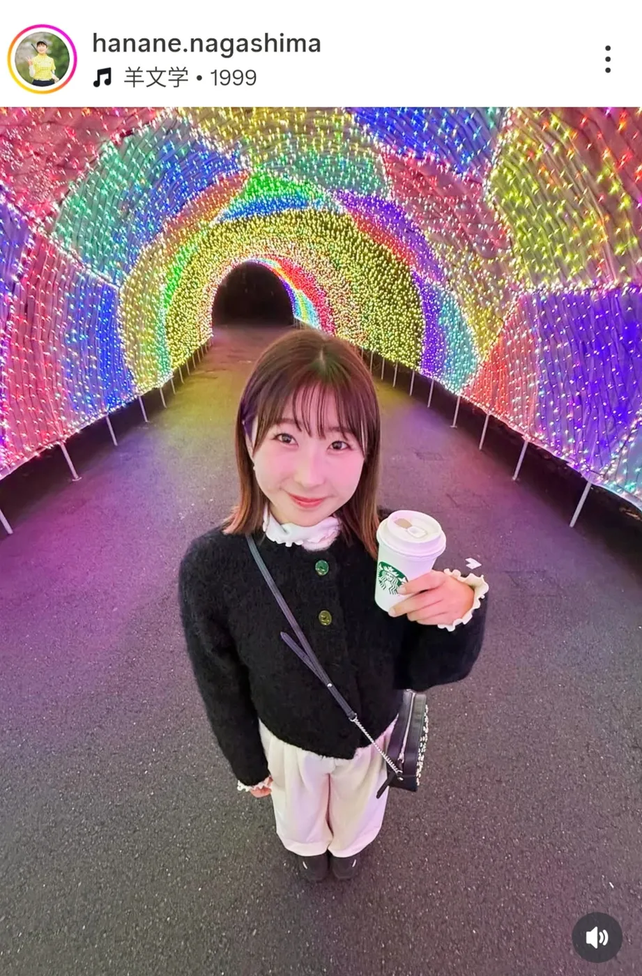 鮮やかなイルミネーションのトンネルで【写真:永嶋花音のInstagram(@hanane.nagashima)より】
