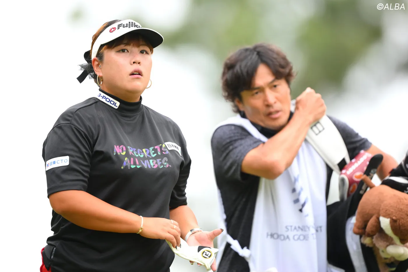 大畑大介をキャディにラウンドするささきしょうこ(撮影:佐々木啓