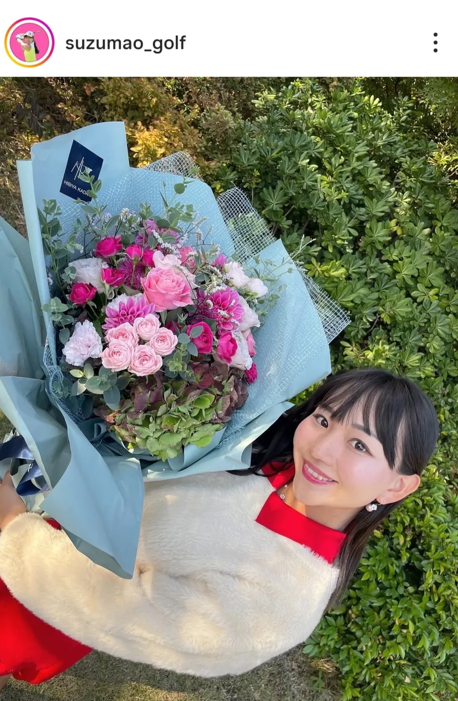 ドラコンプロタイトルマッチで優勝した鈴木真緒がお祝いの花束に大喜び 「お花って見てるだけで幸せになる」