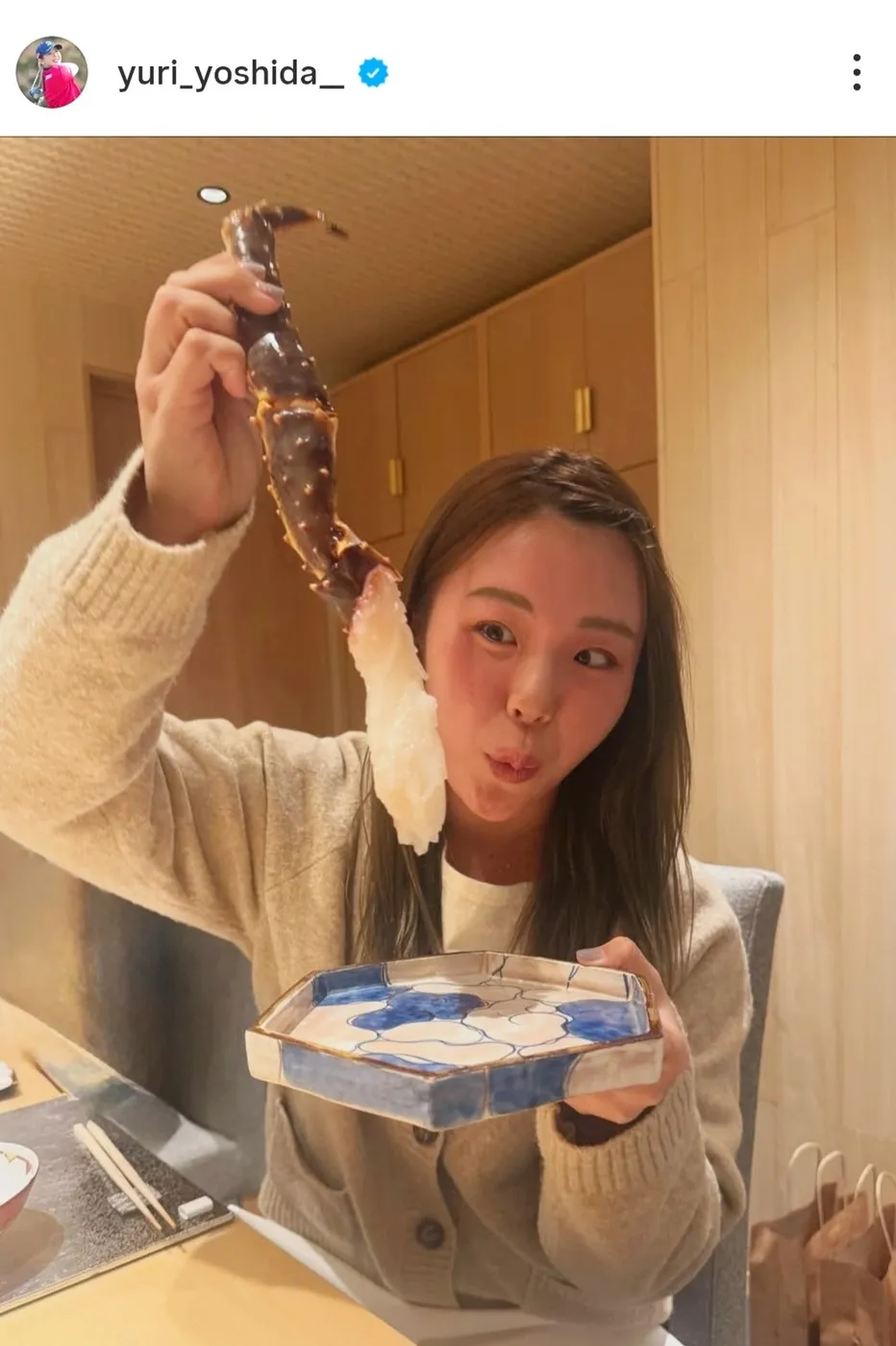 大きなカニの足を嬉しそうに見つめる吉田優利【写真:吉田優利のInstagram(@yuri_yoshida__)より】