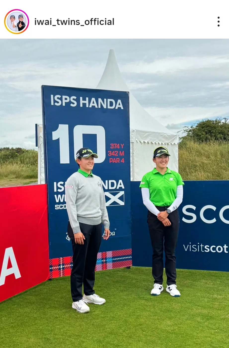 ティーイングエリアで、笑顔の2ショット【写真:岩井姉妹スタッフの公式Instagram(@iwai_twins_official)より】