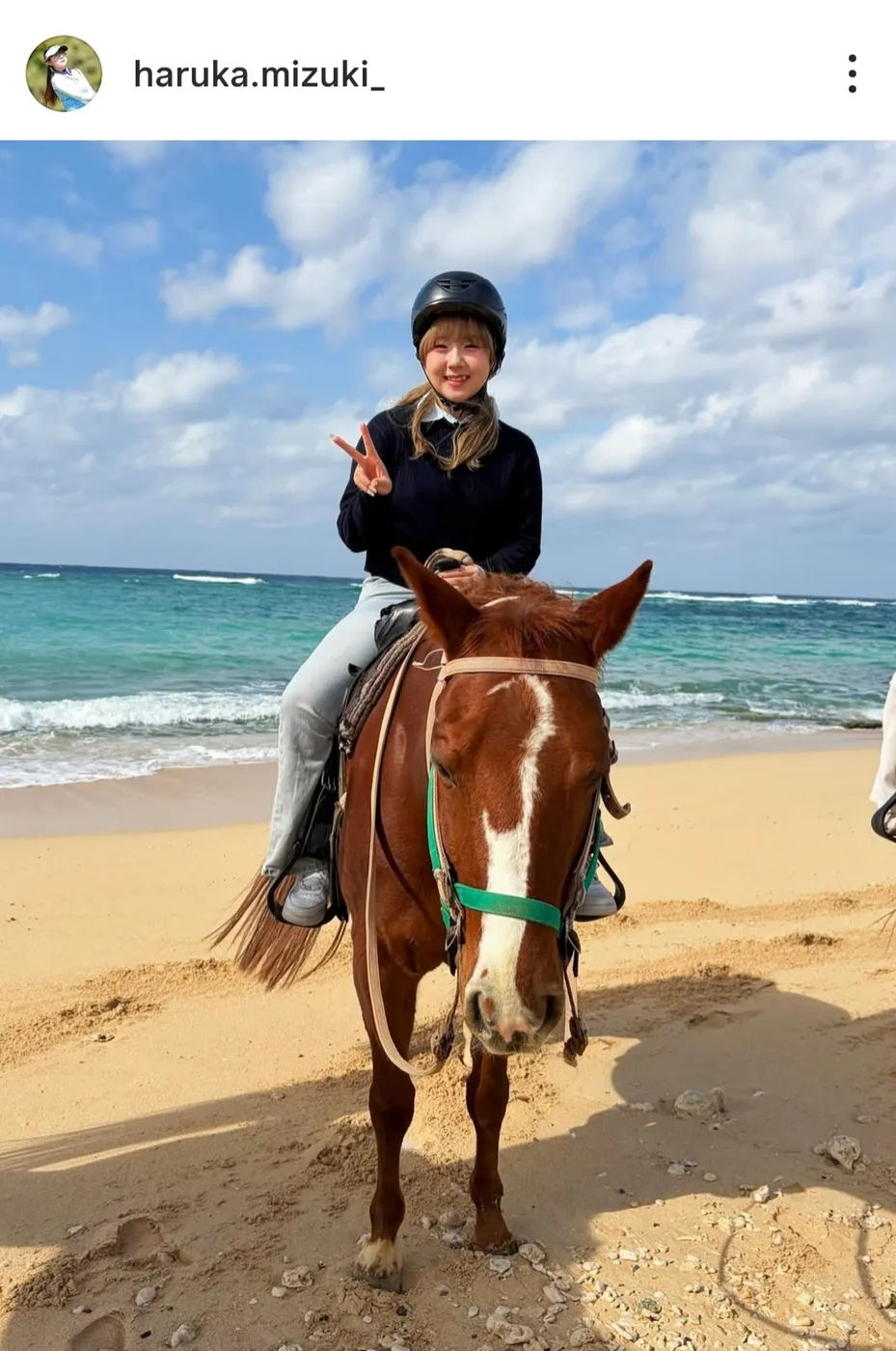 「馬もデレデレ!?」 昨年、ルーキーで下部ツアーVを飾った水木春花の沖縄乗馬や水着姿に反響
