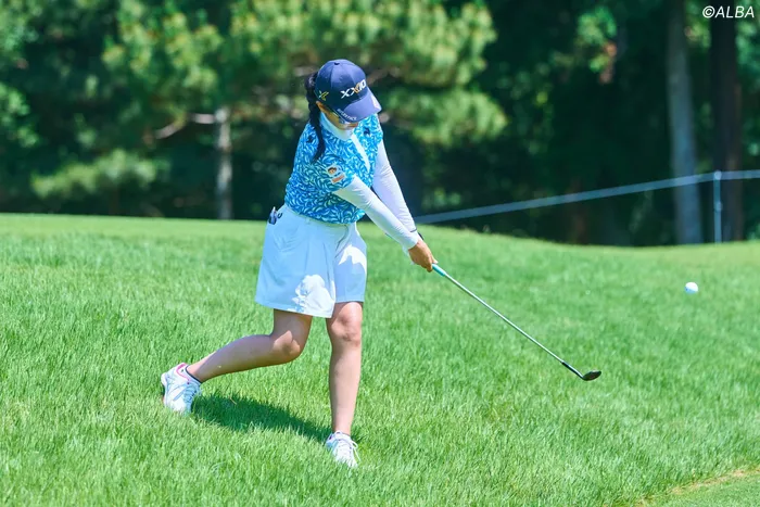 球が上がりづらい左足下がりのラフ 菅沼菜々は右ヒザの送りでヘッドを低く振り抜いていた
