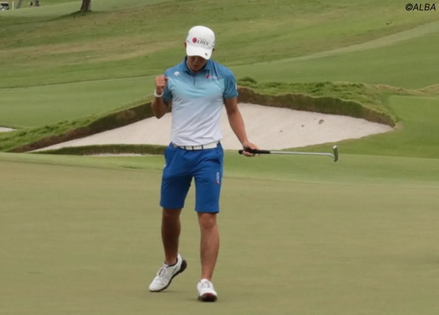 力強いガッツポーズとともにラウンドを終えた中島啓太 (撮影:ALBA)