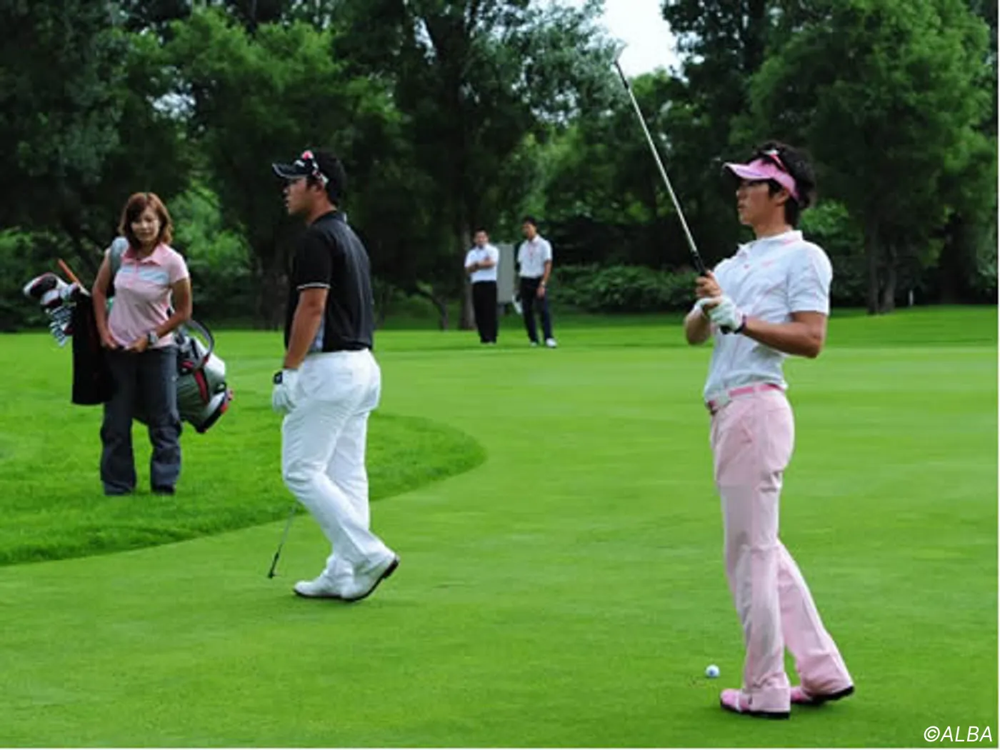 先輩の薗田とハーフをラウンド、先輩からのアドバイスに耳を傾けるなど練習に余念がなかった (撮影:岩井康博)