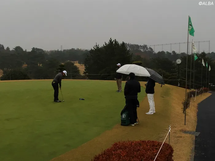 日も落ちかけたパッティンググリーンで、一人練習する金谷 (撮影:ALBA)