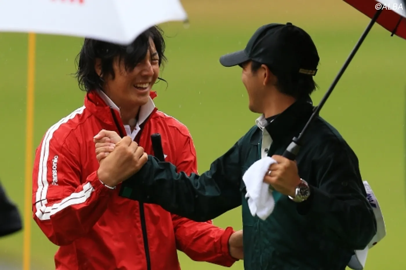 苦楽を共にした加藤キャディとがっちり握手 (撮影:岩本芳弘)