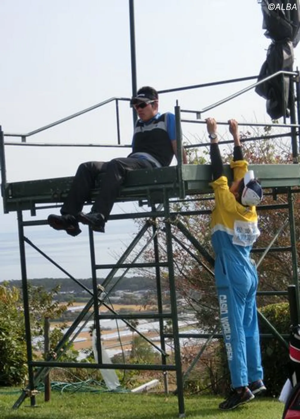 眺めのいいカメラ台に上り、前の組のプレーが終わるのを待つ松山 (撮影:ALBA)