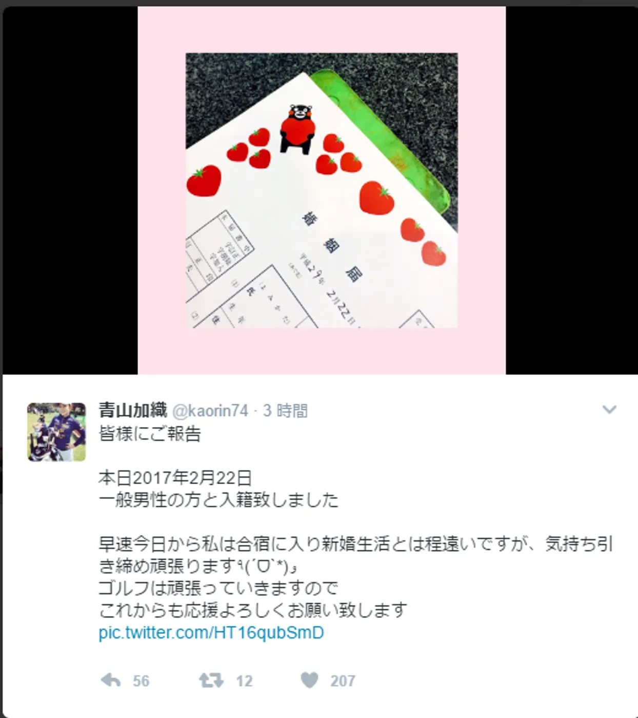 青山加織が一般男性と入籍!婚姻届の保証人は岡本綾子と表純子