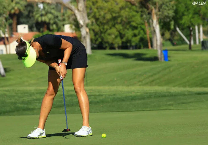 個性的なパッティングスタイルのウィ 手元はクロスハンドだ (撮影:福田文平)